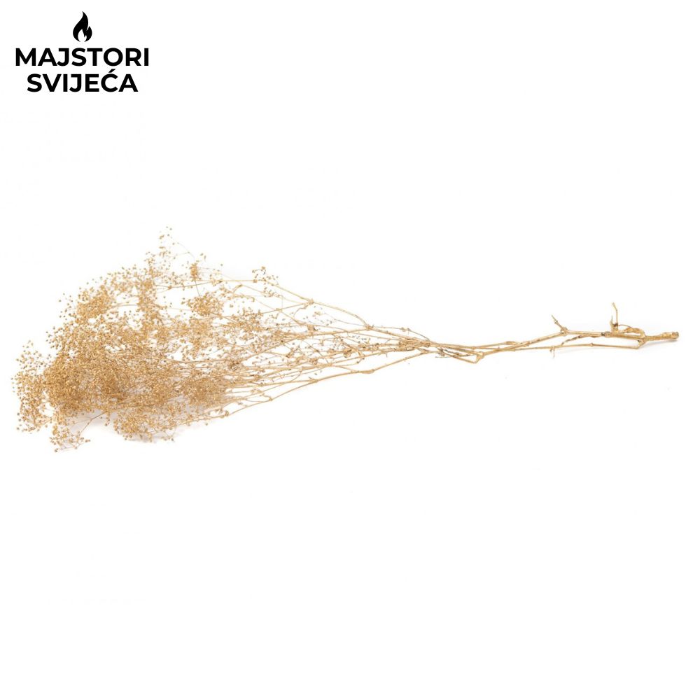 Mini gipsofila u zlatnoj boji jedno je od najtraženijih suhih cvjetova za dekoracije jer svojim sitnim cvjetićima stvara profinjen i luksuzan vizualni dojam. Ova nježna dekorativna biljka savršeno se uklapa u izradu svijeća, aranžmana, poklon pakiranja i raznih kreativnih projekata.